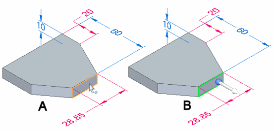 例如,在单击单个模型面 (A) 时,只会显示方向盘上的原点把手和主轴 (B)。