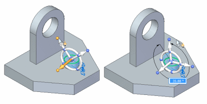 原点旋钮用于重新定位方向盘。当原点在面上移动时,轴将与有效的几何体对齐。要在重新定位时保持方向盘的原始方向,则按住 Shift 键并单击原点旋钮。