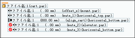 零件 2 将下降到零件 3 这一层,小车也随之下降。发生这种情况是因为当电动机变量达到变量表公式中的条件时,与零件 1 之间的贴合关系被抑制,和零件 2 之间的贴合关系被取消抑制。
