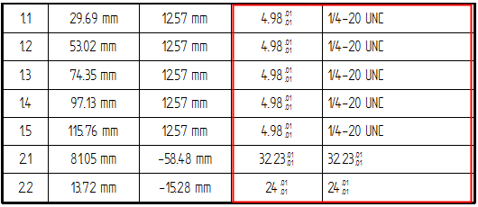 层叠公差显示在最后两列“大小”和“直径/螺纹”的大小和直径值上。