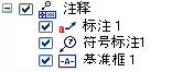 注释 - 指引线、符号标注、标注、表面纹理符号、焊接符号、边状态、特征控制框、基准框及基准目标。