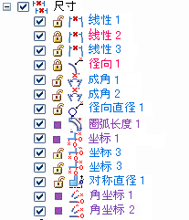 在 PMI 集合内,不同类型的尺寸(例如,线性、径向、角度尺寸)在路径查找器上将显示唯一的符号和元素名称。而且,还会显示其各自的颜色代码。