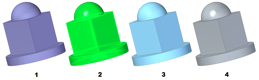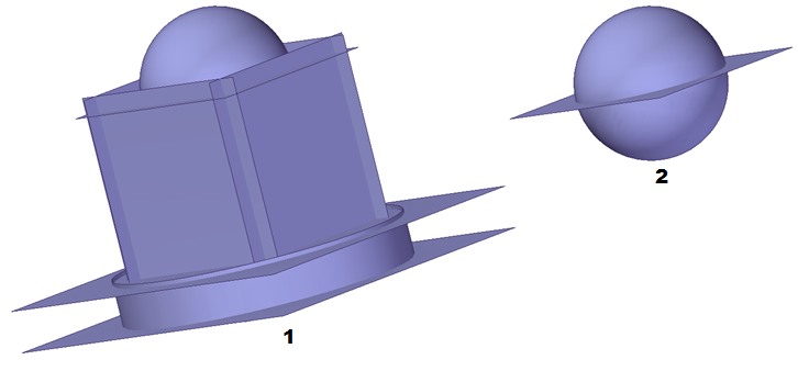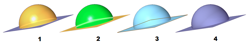 在此示例中,相交命令用于标识要丢弃的曲面的区域。球曲面和顶部平的曲面是选定 (1)。球的底部区域是删除 (2),以及圆形区域的平的曲面 (3) 在球的交点处和平的曲面。这两个曲面现在具有允许它们缝合在一起 (4) 的边界条件。