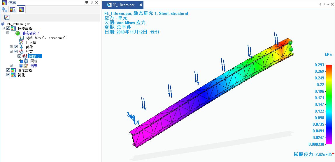 仿真模型以及先前施加的载荷和约束显示在图形窗口中。
