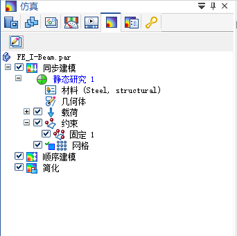 在路径查找器中,仿真研究导航窗格处于打开状态。如以下示例所示,除结果外,所有研究输入都已从 Simulation Express 复制到 青翼 CAD 仿真。