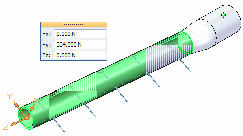 选择该条的内柱面和外柱面。在 Fy 分量框中,输入力值 334 N (75 lbf)。将 Fx 和 Fz 分量设置为零。