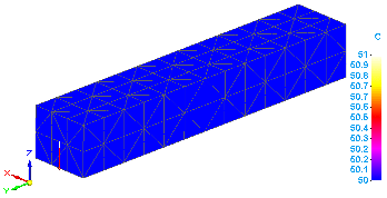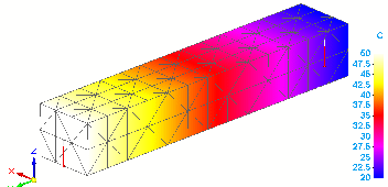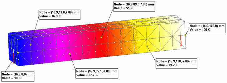 当温度载荷放置在对立端上(在此示例中为 10 C 和 100 C)时,热能将穿过整个条传导。