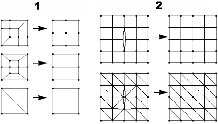 以下示例显示了使用网格划分后清理时的网格阵列和生成的网格。在 1 中演示了阵列的清理前和清理后状态;在 2 中已去除了不需要的菱形单元。