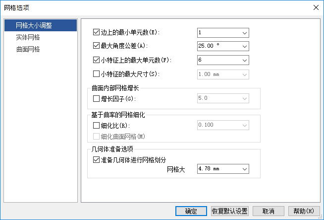 指定一个用户定义的值,以便提取划分网格所需的几何体,并忽略低于该值的小平面和长条面。可以尝试不同的值并对模型重新划分网格,以实现成功的网格。