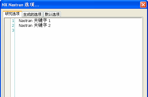 NX Nastran 关键字编辑器是一种多选项卡式的文本编辑窗口,供高级用户查看默认处理选项,以及将用户定义的关键字和值添加到 Study Name.rcx 文件中并进行编辑。此编辑器显示三个选项卡: