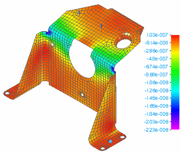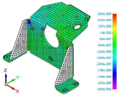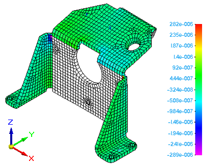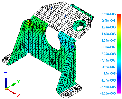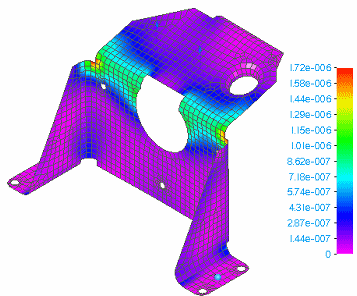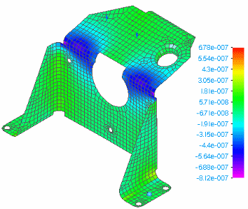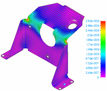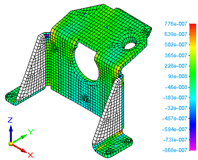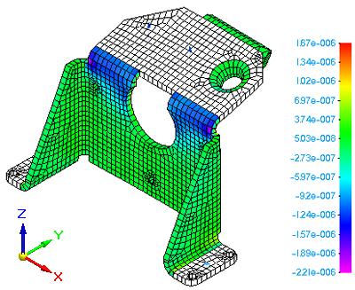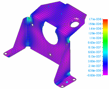 在线性静态、正则模态和屈曲研究中,可以使用应变图估算在施加载荷和约束时某零件相对于其原始大小和形状所经受的变形量和伸长率。