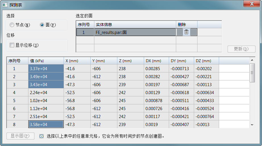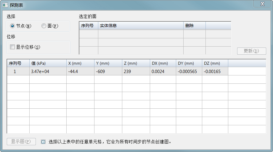 要在探测标签中除 X, Y, Z 节点位置以外还显示 DX, DY, DZ 相对位移值,单击显示位移。