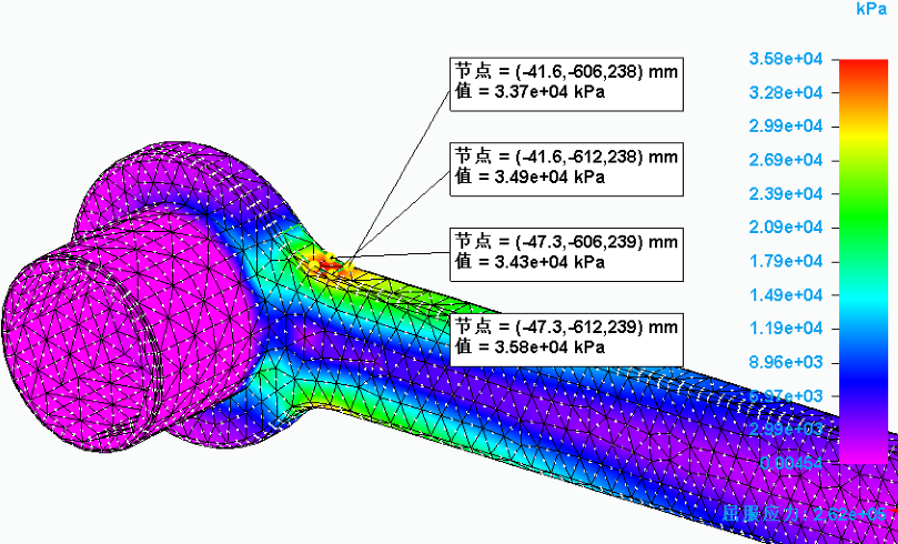 节点 - 根据颜色条上色标的指示,检查模型上高应力区域中的一个或多个单独节点。
