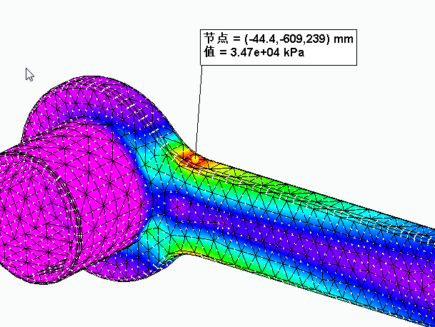 使用探测命令可显示有关网格元素相交处各个几何节点的详细分析数据。可以选择逐个节点显示应力值,也可以显示所选面或边上的所有值。