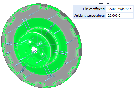 。 将对流载荷施加于刹车盘的所有表面(刹车片表面除外)。指派自然对流的对流传热系数值 22.000 W/m^2-K 和环境温度 20.000 C。
