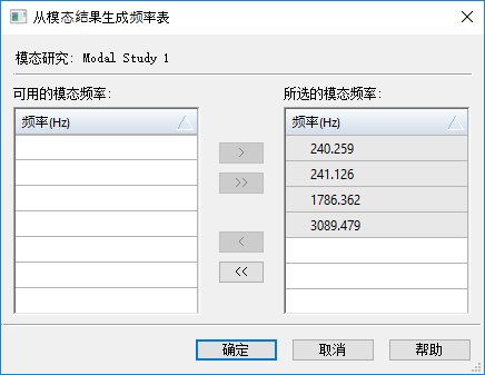 在从模态结果生成频率表对话框中,选择想要调查的模态研究的相应频率范围,或选择从低到高的范围。