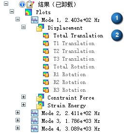 正则模态分析求解模型的特征值 (1) 和特征向量 (2),并在仿真窗格的图节点下显示它们。