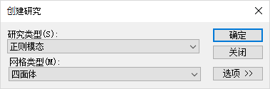 选择仿真选项卡→新建研究命令。在创建研究对话框中,从研究类型列表中选择正则模态,然后为模型选择相应网格类型。单击确定以接受此类研究的所有默认选项。