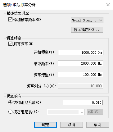 在选项: 谐波频率分析对话框中,定义研究处理参数。
