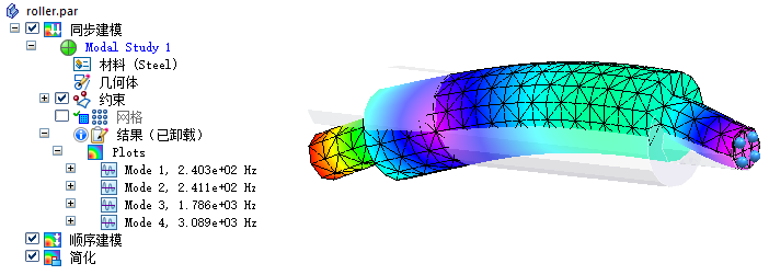 此示例显示零件模型,roller.par。它演示了如何使用正则模态研究中的固有频率作为谐波响应研究的输入。但是,这是可选的。可以直接跳到创建并求解谐波响应研究区段。