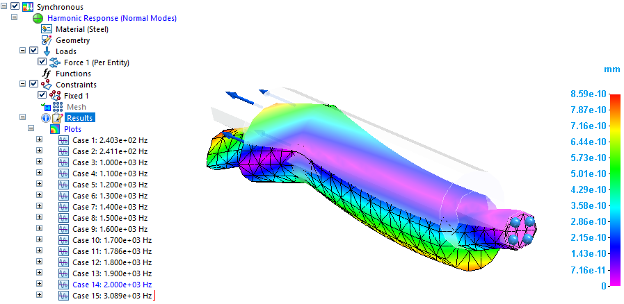 在此示例中,所有四个模态频率均包含在谐波频率响应分析中。这不会影响仿真结果值,只影响生成的结果数。