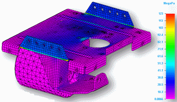 | 显示结构载荷和约束的应力结果。将一个力载荷应用于支架顶部的面,将固定约束应用于两个边缘。 | 显示应用热载荷(温度和对流)对应用于模型的结构载荷(力)和约束(固定)的影响。 |