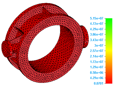 注意,将会使用 Spotlight 色谱(红色、黄色、绿色),以及所有结果比例(实际安全系数值)来显示安全系数图。可以使用颜色条选项卡更改这些设置及其他设置。例如,可以选择用户定义比例,并输入适用于模型的最小和最大的安全系数值。