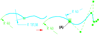 如果要使元素即保持相切又具有相同的曲率半径时,相切 + 等曲率选项特别有用。此选项要求选择的第一个元素是 B 样条曲线。第二个元素可以为任何非线性元素,如弧、圆、椭圆、B 样条曲线或非线性边。当选择 B 样条曲线时,此关系可应用于曲线上最靠近所选位置的编辑点。在此示例中,B 样条曲线在端点处的曲率半径等于圆弧半径,因为选择位置最接近于曲线末端的编辑点 (A)。