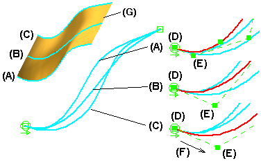例如,当定义放样曲面 (G) 的曲线时,可使用平行相切矢量选项约束曲线 (A) 和 (B),随后使用相同的选项约束曲线 (B) 和 (C)。尽管每条曲线在其端点处的曲率半径不同,每条曲线上由第一和第二编辑点(D 和 E)表示的相对角度相同,这是由于采用了“平行相切矢量”选项的原因。