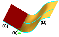 为了确保前例中用于形成自由曲面的曲线与临近曲面平滑过渡,可以采用平行相切矢量选项 (A),在自由曲面上的 b 样条曲线 (B) 和平的曲面的线性边 (C) 之间应用相切关系。这就使两个面平滑过渡,而无尖点。