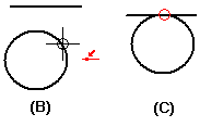 单击另一个元素(B)。移动一个元素以使两个元素相切 (C)。