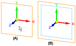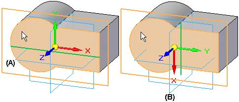 创建新的与选定零件面或现有参考平面重合的参考平面。当根据已有的参考平面 (A) 创建新的参考平面时,新建参考平面 (B) 的 X 轴方向与已有参考平面的 X 轴方向相符。