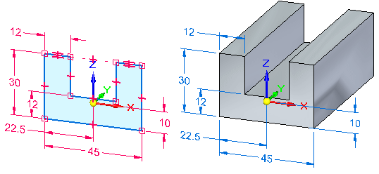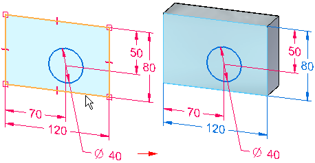 在此过程中,尺寸和约束可能同时与体边和剩余草图几何元素相连接。如果草图包含层叠的尺寸,则部分层叠中的尺寸将可能独自迁移。其他尺寸(如坐标尺寸)将直到附加了它们的所有 2D 几何体都已用于构造特征之后才会迁移。