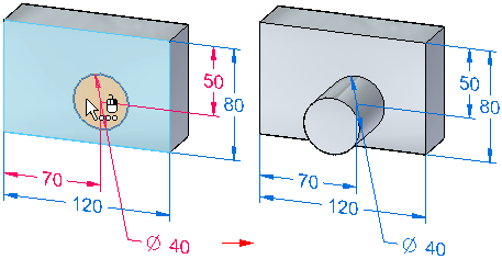 在同步建模环境中使用草图元素构造特征时,只要可能,便会消耗草图元素,而且您放置在草图上的 2D 尺寸会作为从动尺寸迁移到实体合适的边上。