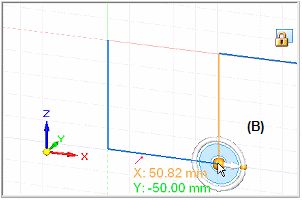 (在同步建模中)在图形窗口中,单击位于方向盘 (A) 中心的原点,然后单击想要放置新栅格原点的位置 (B)。