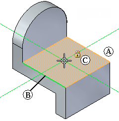 当您启用一个使用草图平面的命令,并接着将光标定位在一个参考平面或平的面上时,该参考平面或平的面 (A) 将高亮显示,且平面的边 (B) 也将高亮显示,以指示当前草图平面的 x 轴。从光标向外延伸的对齐直线自身也和光标下的平面对齐。如果您要手工锁定草图平面,则也会显示一个锁定符号 (C),这将在稍后进行讨论。