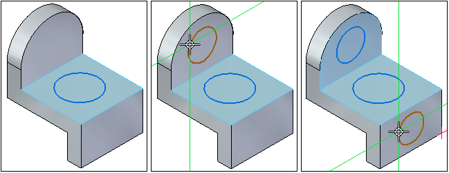 草图平面锁定使您可以轻松地在模型的多个面上快速绘图。例如,在绘制了第一个圆后,可以右键单击以重新启动命令,然后在第二个面上绘制圆,再次右键单击,然后在第三个面上绘制圆。