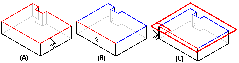 创建一个新的、与选定的零件面或某一现有参考平面重合的参考平面。例如,可以通过选择一个零件面 (A) 来定义新的参考平面,然后通过将光标放置在 x 轴的端点附件 (C) 来指定 x 轴的原点和方向。将显示新参考平面的动态表示。