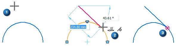 当光标处显示“元素上的点”和“相切”智能草图关系指示符时,单击以定义直线的端点 (3)。