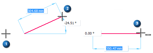 在轮廓窗口中四处移动光标。注意直线会跟随光标一起移动 (2)。同时,“智能草图”将识别遇到的所有关系,如水平方向 (3)。当找到关系时,“智能草图”会在光标处显示关系指示器。