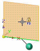 当您高亮显示要在其上绘制草图的坐标系平面、平的面或参考平面时,将自动显示默认的 X 轴方位 (1)。