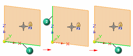 当您正在定义草图平面并且默认的 X 轴已高亮显示 (1) 时,可以使用快捷键来更改 X 轴方位。例如,可按 N 键来选择下一个线性边 (2),或按 B 键来选择上一个线性边 (3)。