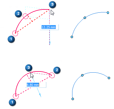 可以用三个点画出一段圆弧。第一点定义一个端点。然后,您可以先定义弧线上的一个点再定义端点,也可以先定义端点再定义弧线上的一个点。端点与其他元素不相切或垂直。