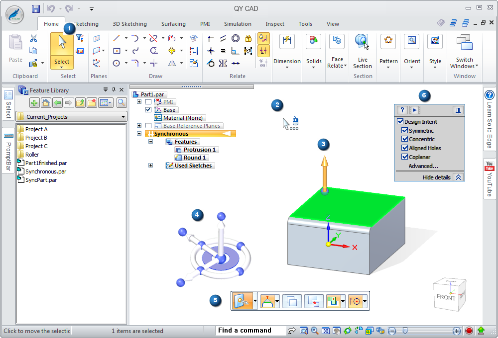 以下示例显示了同步建模零件文件中可用的建模工具。其中一些这些工具也可用于顺序建模(基于历史记录)环境。