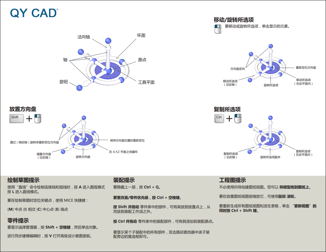 还可以单击下载并打开以下 PDF 格式 (qrc.pdf) 的 快速参考卡 。它包含在 青翼 CAD 中使用同步建模技术工具的便捷的快捷方式。
