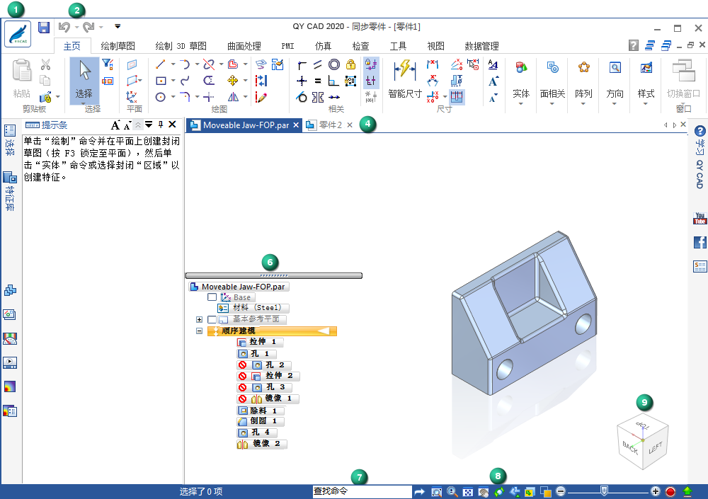 以下示例显示零件文件 Moveable Jaw-FOP.par 的 青翼 CAD2021 用户界面的默认布局。此零件是在顺序建模环境中创建的。