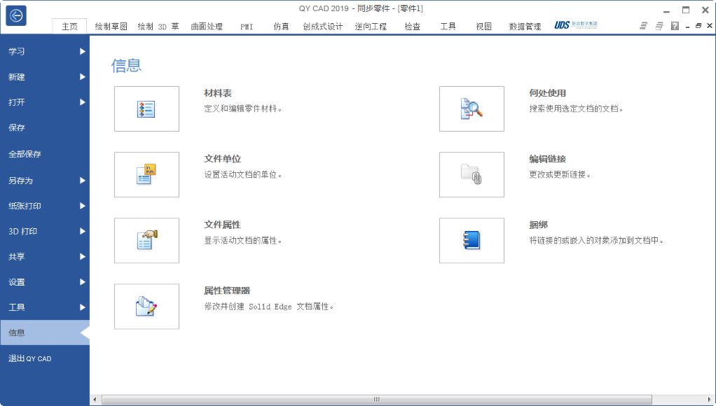 | 审核和更新材料和文档属性的全局设置。对于零件、装配和工程图文档而言,可用的选项是不同的。 | 打开文档并单击信息选项卡。