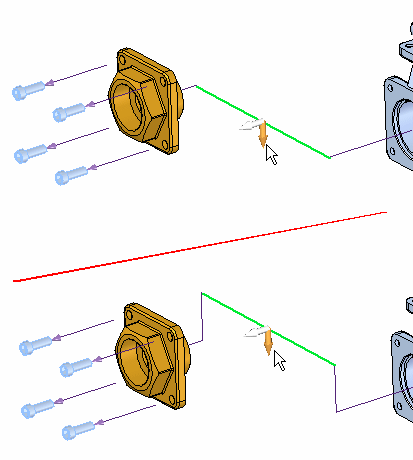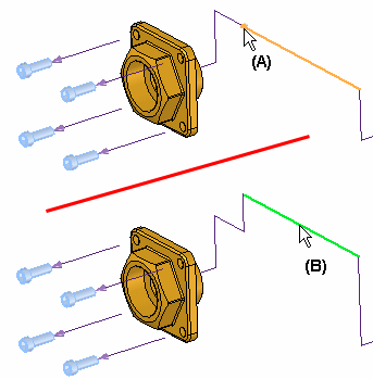 如果使用“拖动部件”命令将零件移动到原始爆炸矢量之外,榫接则会添加到飞行线上。对于事件飞行线,可以使用“修改”命令将榫接段 (A) 拖到新位置 (B)。