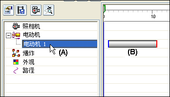 向动画添加事件时,事件条目 (A) 被添加到左侧窗格中的事件类别,并且至少一个事件持续时间条(B) 被添加到右侧窗格。例如,向装配动画中添加发动机事件时,发动机时间条目 (A) 被添加到左侧窗格的发动机类别中,二次发动机事件的事件持续时间条 (B) 被添加到右侧窗格。