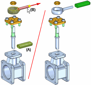 在指定的方向爆炸一个或多个零件。选定要爆炸的零件 (A) 沿着您通过在基本零件或参考零件 (B) 上选择面或参考平面而定义的爆炸矢量偏置。